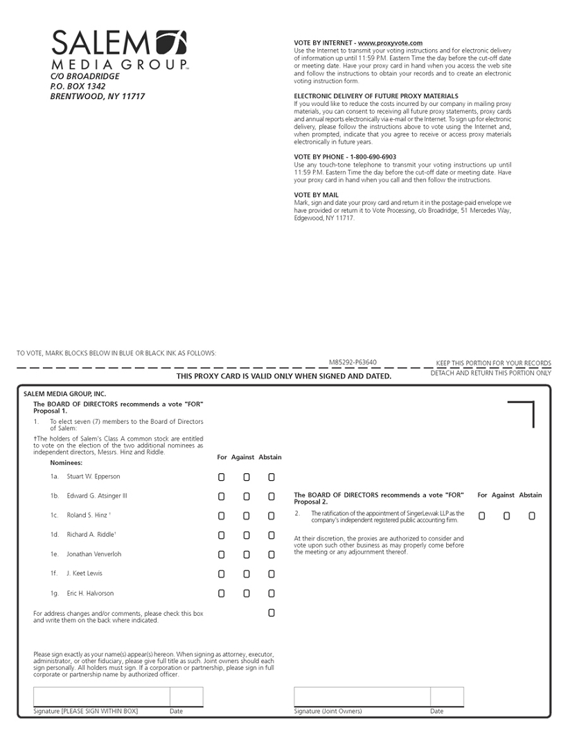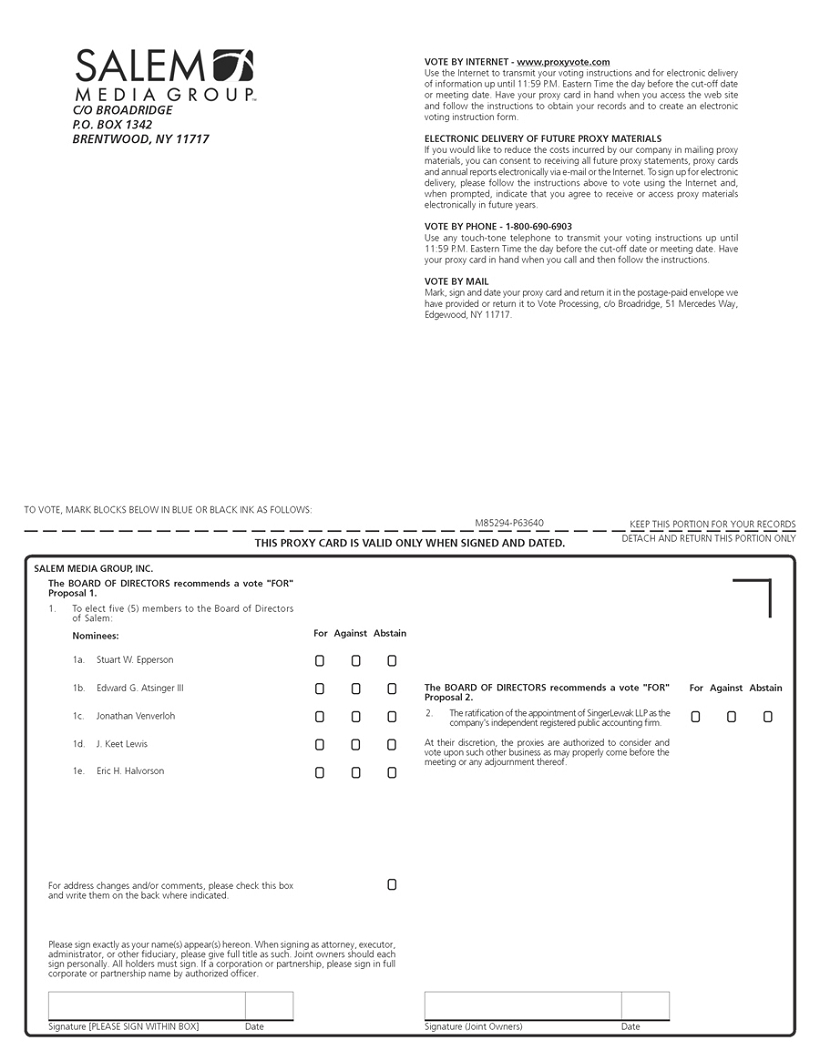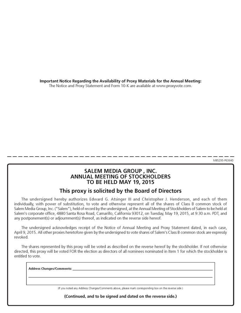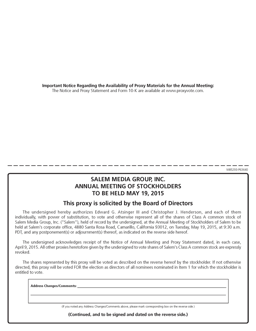 You are cordially invited to attend the 2015 Annual Meeting of Stockholders (the “Annual Meeting”) of Salem Media Group, Inc. (“Salem”). The Annual Meeting is scheduled to be held on Tuesday, May 19, 2015, at Salem’s corporate offices, which are located at 4880 Santa Rosa Road, Camarillo, California, at 9:30 a.m. P.D.T. As described in the accompanying Notice of Annual Meeting of Stockholders and Proxy Statement, the agenda for the Annual Meeting includes: