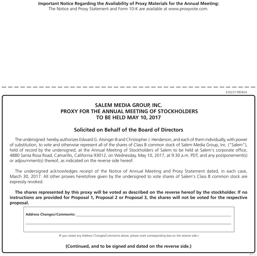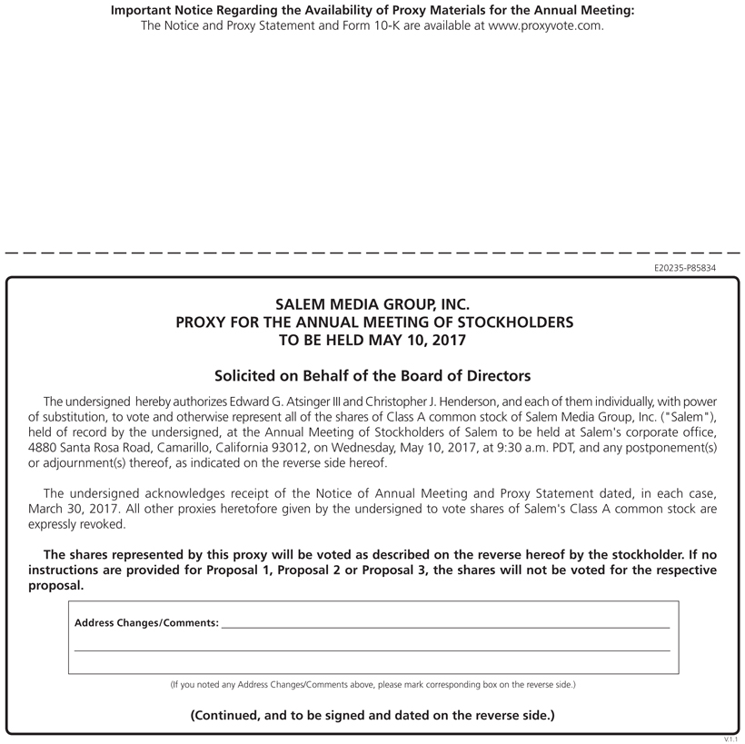 You are cordially invited to attend the 2017 Annual Meeting of Stockholders (the “Annual Meeting”) of Salem Media Group, Inc. (“Salem” or the “Company”). The Annual Meeting is scheduled to be held on Wednesday, May 10, 2017, at Salem’s corporate offices, which are located at 4880 Santa Rosa Road, Camarillo, California, at 9:30 a.m. P.D.T. As described in the accompanying Notice of Annual Meeting of Stockholders and Proxy Statement, the agenda for the Annual Meeting includes: