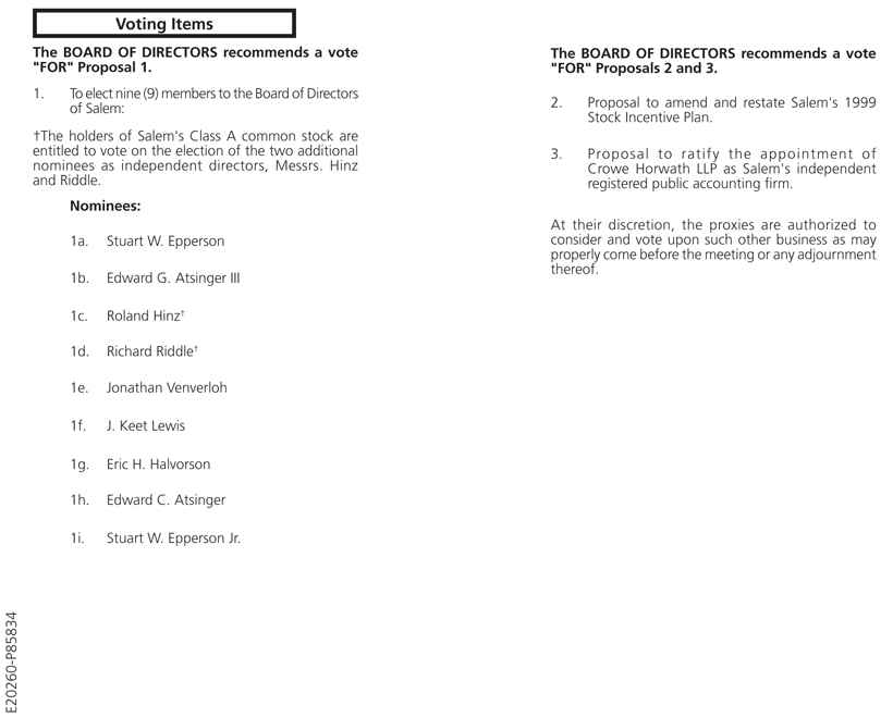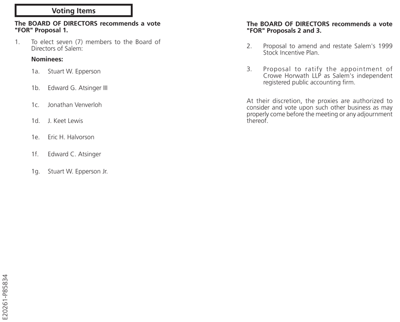 The Board of Directors recommends that you vote FOR the election of the slate of Director nominees, FOR the proposal to amend and restate the Company’s 1999 Stock Incentive Plan and FOR the proposal to ratify the appointment of Crowe Horwath LLP as the Company’s independent registered public accounting firm. Please refer to the Proxy Statement for detailed information on the above proposals. Directors and executive officers of Salem will be present at the Annual Meeting to respond to questions that our stockholders may have regarding the business to be transacted.