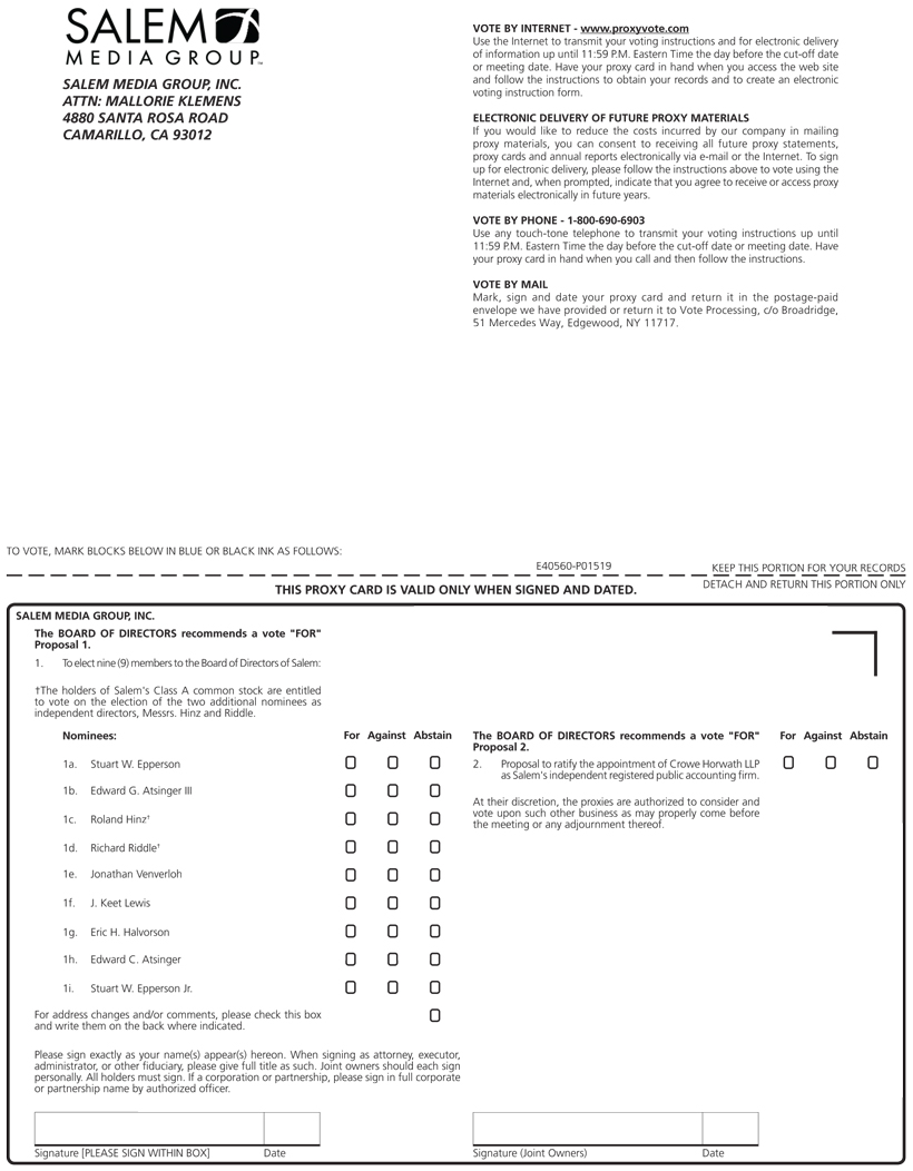 SALEM MEDIA GROUP, INC. ATTN: MALLORIE KLEMENS 4880 SANTA ROSA ROAD CAMARILLO, CA 93012 VOTE BY INTERNET - www.proxyvote.com Use the Internet to transmit your voting instructions and for electronic delivery of information up until 11:59 P.M. Eastern Time the day before the cut-off date or meeting date. Have your proxy card in hand when you access the web site and follow the instructions to obtain your records and to create an electronic voting instruction form. ELECTRONIC DELIVERY OF FUTURE PROXY MATERIALS If you would like to reduce the costs incurred by our company in mailing proxy materials, you can consent to receiving all future proxy statements, proxy cards and annual reports electronically via e-mail or the Internet. To sign up for electronic delivery, please follow the instructions above to vote using the Internet and, when prompted, indicate that you agree to receive or access proxy materials electronically in future years. VOTE BY PHONE - 1-800-690-6903 Use any touch-tone telephone to transmit your voting instructions up until 11:59 P.M. Eastern Time the day before the cut-off date or meeting date. Have your proxy card in hand when you call and then follow the instructions. VOTE BY MAIL Mark, sign and date your proxy card and return it in the postage-paid envelope we have provided or return it to Vote Processing, c/o Broadridge, 51 Mercedes Way, Edgewood, NY 11717. TO VOTE, MARK BLOCKS BELOW IN BLUE OR BLACK INK AS FOLLOWS: E40560-P01519 KEEP THIS PORTION FOR YOUR RECORDS THIS PROXY CARD IS VALID ONLY WHEN SIGNED AND DATED. DETACH AND RETURN THIS PORTION ONLY SALEM MEDIA GROUP, INC. The BOARD OF DIRECTORS recommends a vote "FOR" Proposal 1. 1. To elect nine (9) members to the Board of Directors of Salem: †The holders of Salem's Class A common stock are entitled to vote on the election of the two additional nominees as independent directors, Messrs. Hinz and Riddle. Nominees: For Against Abstain 1a. Stuart W. Epperson 1b. Edward G. Atsinger III 1c. Roland Hinz† 1d. Richard Riddle† 1e. Jonathan Venverloh 1f. J. Keet Lewis 1g. Eric H. Halvorson 1h. Edward C. Atsinger 1i. Stuart W. Epperson Jr. For address changes and/or comments, please check this box and write them on the back where indicated. Please sign exactly as your name(s) appear(s) hereon. When signing as attorney, executor, administrator, or other fiduciary, please give full title as such. Joint owners should each sign personally. All holders must sign. If a corporation or partnership, please sign in full corporate or partnership name by authorized officer. Signature [PLEASE SIGN WITHIN BOX] Date The BOARD OF DIRECTORS recommends a vote "FOR" For Against Abstain Proposal 2. 2. Proposal to ratify the appointment of Crowe Horwath LLP as Salem's independent registered public accounting firm. At their discretion, the proxies are authorized to consider and vote upon such other business as may properly come before the meeting or any adjournment thereof. Signature (Joint Owners) Date