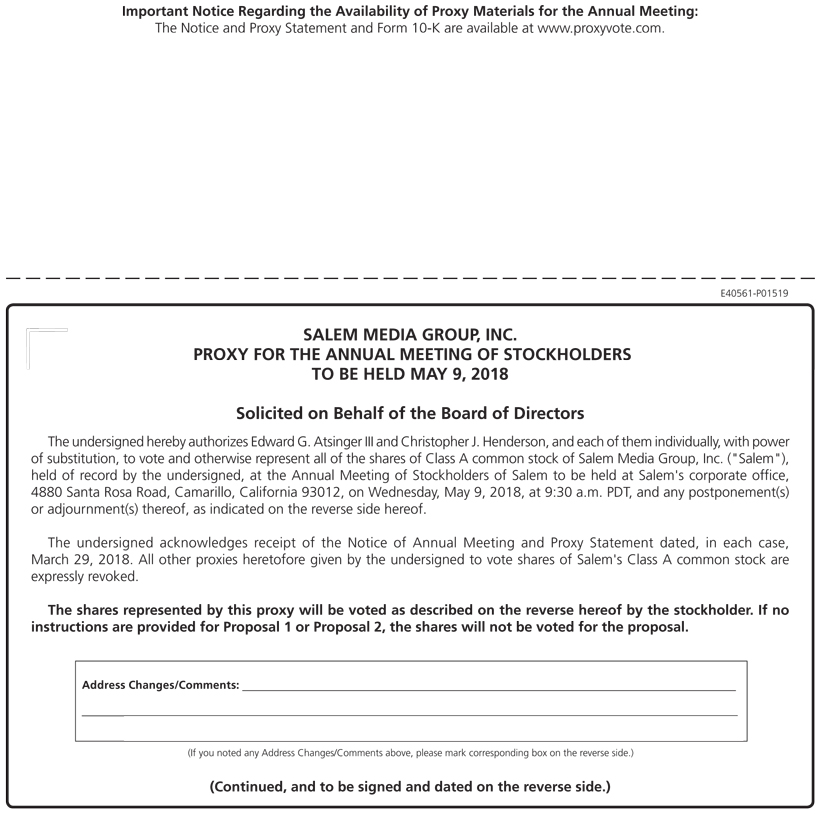 Important Notice Regarding the Availability of Proxy Materials for the Annual Meeting: The Notice and Proxy Statement and Form 10-K are available at www.proxyvote.com. E40561-P01519 SALEM MEDIA GROUP, INC. PROXY FOR THE ANNUAL MEETING OF STOCKHOLDERS TO BE HELD MAY 9, 2018 Solicited on Behalf of the Board of Directors The undersigned hereby authorizes Edward G. Atsinger III and Christopher J. Henderson, and each of them individually, with power of substitution, to vote and otherwise represent all of the shares of Class A common stock of Salem Media Group, Inc. ("Salem"), held of record by the undersigned, at the Annual Meeting of Stockholders of Salem to be held at Salem's corporate office, 4880 Santa Rosa Road, Camarillo, California 93012, on Wednesday, May 9, 2018, at 9:30 a.m. PDT, and any postponement(s) or adjournment(s) thereof, as indicated on the reverse side hereof. The undersigned acknowledges receipt of the Notice of Annual Meeting and Proxy Statement dated, in each case, March 29, 2018. All other proxies heretofore given by the undersigned to vote shares of Salem's Class A common stock are expressly revoked. The shares represented by this proxy will be voted as described on the reverse hereof by the stockholder. If no instructions are provided for Proposal 1 or Proposal 2, the shares will not be voted for the proposal. Address Changes/Comments: (If you noted any Address Changes/Comments above, please mark corresponding box on the reverse side.) (Continued, and to be signed and dated on the reverse side.)
