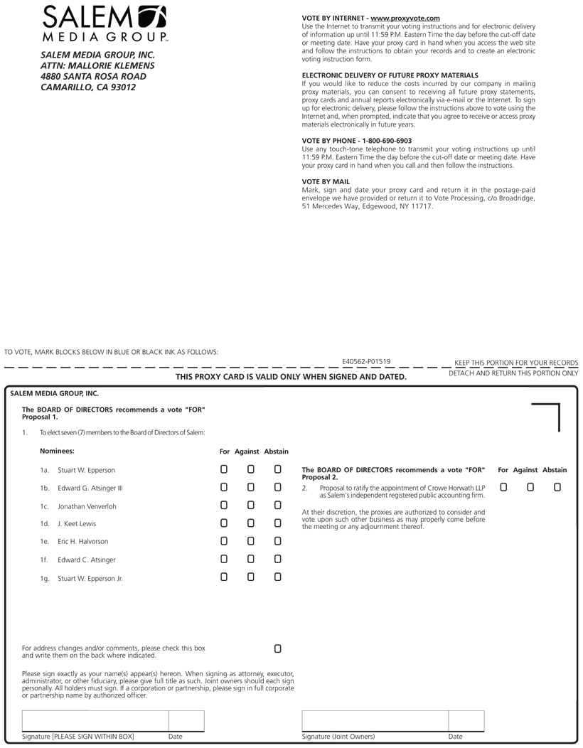 SALEM MEDIA GROUP, INC. ATTN: MALLORIE KLEMENS 4880 SANTA ROSA ROAD CAMARILLO, CA 93012 VOTE BY INTERNET - www.proxyvote.com Use the Internet to transmit your voting instructions and for electronic delivery of information up until 11:59 P.M. Eastern Time the day before the cut-off date or meeting date. Have your proxy card in hand when you access the web site and follow the instructions to obtain your records and to create an electronic voting instruction form. ELECTRONIC DELIVERY OF FUTURE PROXY MATERIALS If you would like to reduce the costs incurred by our company in mailing proxy materials, you can consent to receiving all future proxy statements, proxy cards and annual reports electronically via e-mail or the Internet. To sign up for electronic delivery, please follow the instructions above to vote using the Internet and, when prompted, indicate that you agree to receive or access proxy materials electronically in future years. VOTE BY PHONE - 1-800-690-6903 Use any touch-tone telephone to transmit your voting instructions up until 11:59 P.M. Eastern Time the day before the cut-off date or meeting date. Have your proxy card in hand when you call and then follow the instructions. VOTE BY MAIL Mark, sign and date your proxy card and return it in the postage-paid envelope we have provided or return it to Vote Processing, c/o Broadridge, 51 Mercedes Way, Edgewood, NY 11717. TO VOTE, MARK BLOCKS BELOW IN BLUE OR BLACK INK AS FOLLOWS: E40562-P01519 KEEP THIS PORTION FOR YOUR RECORDS THIS PROXY CARD IS VALID ONLY WHEN SIGNED AND DATED. DETACH AND RETURN THIS PORTION ONLY SALEM MEDIA GROUP, INC. The BOARD OF DIRECTORS recommends a vote "FOR" Proposal 1. 1. To elect seven (7) members to the Board of Directors of Salem: Nominees: For Against Abstain 1a. Stuart W. Epperson 1b. Edward G. Atsinger III 1c. Jonathan Venverloh 1d. J. Keet Lewis 1e. Eric H. Halvorson 1f. Edward C. Atsinger 1g. Stuart W. Epperson Jr. For address changes and/or comments, please check this box and write them on the back where indicated. Please sign exactly as your name(s) appear(s) hereon. When signing as attorney, executor, administrator, or other fiduciary, please give full title as such. Joint owners should each sign personally. All holders must sign. If a corporation or partnership, please sign in full corporate or partnership name by authorized officer. Signature [PLEASE SIGN WITHIN BOX] Date The BOARD OF DIRECTORS recommends a vote "FOR" For Against Abstain Proposal 2. 2. Proposal to ratify the appointment of Crowe Horwath LLP as Salem's independent registered public accounting firm. At their discretion, the proxies are authorized to consider and vote upon such other business as may properly come before the meeting or any adjournment thereof. Signature (Joint Owners) Date