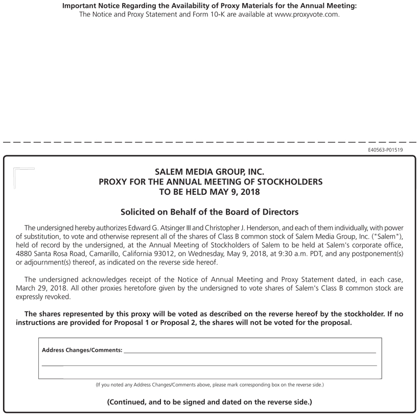Important Notice Regarding the Availability of Proxy Materials for the Annual Meeting: The Notice and Proxy Statement and Form 10-K are available at www.proxyvote.com. E40563-P01519 SALEM MEDIA GROUP, INC. PROXY FOR THE ANNUAL MEETING OF STOCKHOLDERS TO BE HELD MAY 9, 2018 Solicited on Behalf of the Board of Directors The undersigned hereby authorizes Edward G. Atsinger III and Christopher J. Henderson, and each of them individually, with power of substitution, to vote and otherwise represent all of the shares of Class B common stock of Salem Media Group, Inc. ("Salem"), held of record by the undersigned, at the Annual Meeting of Stockholders of Salem to be held at Salem's corporate office, 4880 Santa Rosa Road, Camarillo, California 93012, on Wednesday, May 9, 2018, at 9:30 a.m. PDT, and any postponement(s) or adjournment(s) thereof, as indicated on the reverse side hereof. The undersigned acknowledges receipt of the Notice of Annual Meeting and Proxy Statement dated, in each case, March 29, 2018. All other proxies heretofore given by the undersigned to vote shares of Salem's Class B common stock are expressly revoked. The shares represented by this proxy will be voted as described on the reverse hereof by the stockholder. If no instructions are provided for Proposal 1 or Proposal 2, the shares will not be voted for the proposal. Address Changes/Comments: (If you noted any Address Changes/Comments above, please mark corresponding box on the reverse side.) (Continued, and to be signed and dated on the reverse side.)