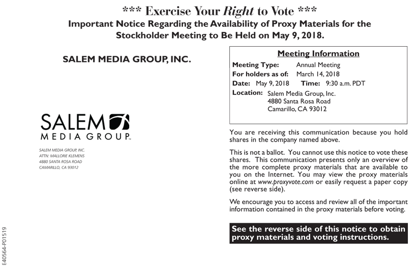 *** Exercise Your Right to Vote *** Important Notice Regarding the Availability of Proxy Materials for the Stockholder Meeting to Be Held on May 9, 2018. SALEM MEDIA GROUP, INC. SALEM MEDIA GROUP, INC. ATTN: MALLORIE KLEMENS 4880 SANTA ROSA ROAD CAMARILLO, CA 93012 E40564-P01519 Meeting Information Meeting Type: Annual Meeting For holders as of: March 14, 2018 Date: May 9, 2018 Time: 9:30 a.m. PDT Location: Salem Media Group, Inc. 4880 Santa Rosa Road Camarillo, CA 93012 You are receiving this communication because you hold shares in the company named above. This is not a ballot. You cannot use this notice to vote these shares. This communication presents only an overview of the more complete proxy materials that are available to you on the Internet. You may view the proxy materials online at www.proxyvote.com or easily request a paper copy (see reverse side). We encourage you to access and review all of the important information contained in the proxy materials before voting. See the reverse side of this notice to obtain proxy materials and voting instructions.