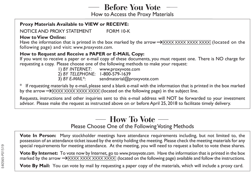 Before You Vote How to Access the Proxy Materials Proxy Materials Available to VIEW or RECEIVE: NOTICE AND PROXY STATEMENT FORM 10-K How to View Online: Have the information that is printed in the box marked by the arrow XXXX XXXX XXXX XXXX (located on the following page) and visit: www.proxyvote.com. How to Request and Receive a PAPER or E-MAIL Copy: If you want to receive a paper or e-mail copy of these documents, you must request one. There is NO charge for requesting a copy. Please choose one of the following methods to make your request: 1) BY INTERNET: www.proxyvote.com 2) BY TELEPHONE: 1-800-579-1639 3) BY E-MAIL*: sendmaterial@proxyvote.com * If requesting materials by e-mail, please send a blank e-mail with the information that is printed in the box marked by the arrowXXXX XXXX XXXX XXXX (located on the following page) in the subject line. Requests, instructions and other inquiries sent to this e-mail address will NOT be forwarded to your investment advisor. Please make the request as instructed above on or before April 25, 2018 to facilitate timely delivery. How To Vote Please Choose One of the Following Voting Methods Vote In Person: Many stockholder meetings have attendance requirements including, but not limited to, the possession of an attendance ticket issued by the entity holding the meeting. Please check the meeting materials for any special requirements for meeting attendance. At the meeting, you will need to request a ballot to vote these shares. Vote By Internet: To vote now by Internet, go to www.proxyvote.com. Have the information that is printed in the box marked by the arrow XXXX XXXX XXXX XXXX (located on the following page) available and follow the instructions. Vote By Mail: You can vote by mail by requesting a paper copy of the materials, which will include a proxy card. E40565-P01519