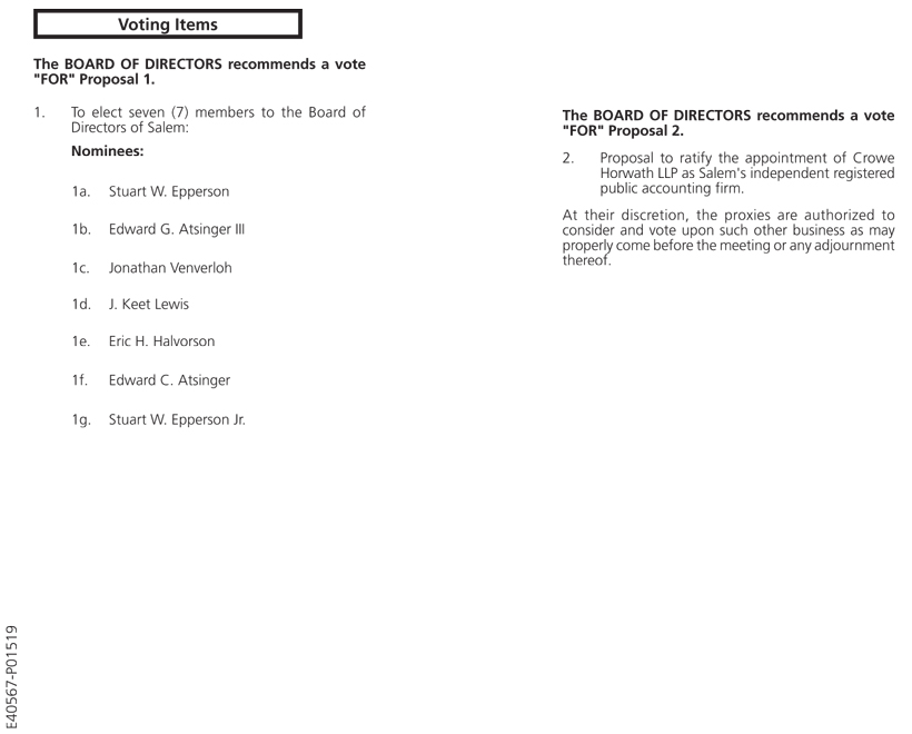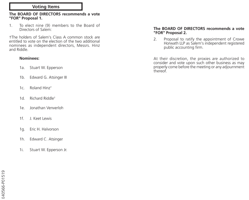 Voting Items The BOARD OF DIRECTORS recommends a vote "FOR" Proposal 1. 1. To elect nine (9) members to the Board of Directors of Salem: †The holders of Salem's Class A common stock are entitled to vote on the election of the two additional nominees as independent directors, Messrs. Hinz and Riddle. Nominees: 1a. Stuart W. Epperson 1b. Edward G. Atsinger III 1c. Roland Hinz† 1d. Richard Riddle† 1e. Jonathan Venverloh 1f. J. Keet Lewis 1g. Eric H. Halvorson 1h. Edward C. Atsinger 1i. Stuart W. Epperson Jr. E40566-P01519 The BOARD OF DIRECTORS recommends a vote "FOR" Proposal 2. 2. Proposal to ratify the appointment of Crowe Horwath LLP as Salem's independent registered public accounting firm. At their discretion, the proxies are authorized to consider and vote upon such other business as may properly come before the meeting or any adjournment thereof.